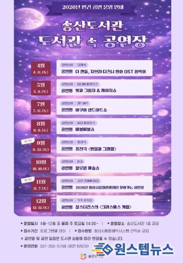원스텝뉴스 천규영 기자 | 화성시문화관광재단 송산도서관은 오는 4월부터 12월까지 지역 주민들에게 풍요로운 문화 체험의 기회를 제공하는 연간 상설 공연 프로그램 '도서관 속 공연장'을 운영한다.