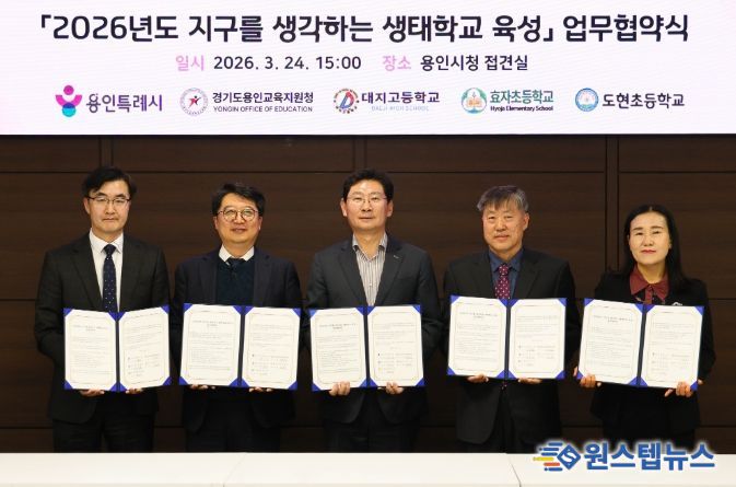 원스텝뉴스 이병희 기자 | 용인특례시는 24일 시청 접견실에서 용인교육지원청을 비롯해 3개 학교와 ‘지구를 생각하는 생태학교 육성사업’을 위한 협약을 맺었다.