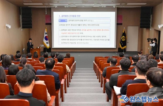 강사로 초빙된 경상남도선거관리위원회 김영환 지도담당관은 공무원의 선거중립 의무, 주요 제한·금지 규정, 실무 현장 위반 사례를 집중적으로 강의했다.
