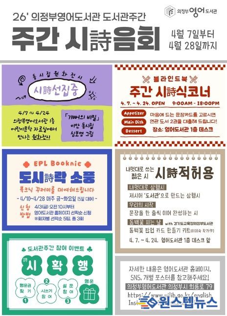 원스텝뉴스 이병희 기자 | 의정부영어도서관은 ‘2026 도서관주간’을 맞아 4월 7일부터 28일까지 의정부시 도서관 이용 시민을 대상으로 독서문화 행사를 진행한다.
