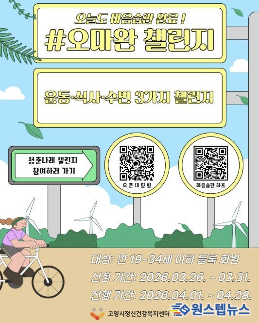 원스텝뉴스 이병희 기자 | 고양시정신건강복지센터는 청년들의 건강한 생활습관 형성을 지원하기 위해 온라인 집단 프로그램 ‘#오마완(오늘도 마음습관 완료) 챌린지’를 오는 31일까지 참여자를 모집한다.
