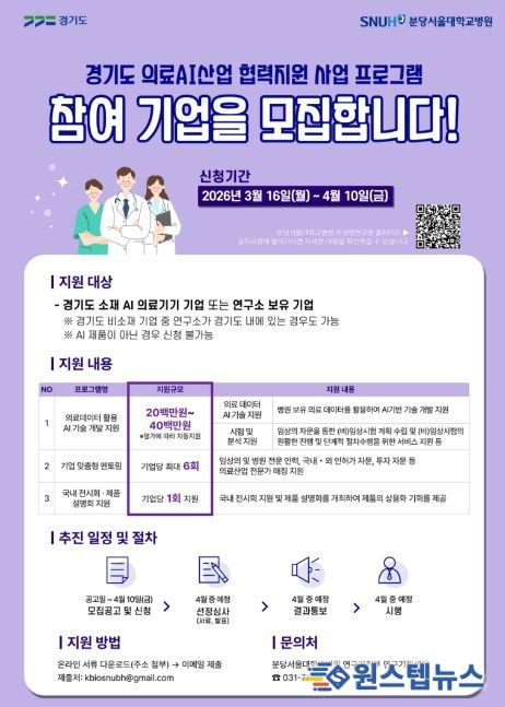 원스텝뉴스 이병희 기자 | 경기도가 4월 10일까지 도내 인공지능(AI) 기반 의료기기 및 솔루션 개발 기업의 상용화 지원을 위해 ‘2026년 경기도 의료AI산업 협력지원 사업’에 참여할 기업을 모집한다.