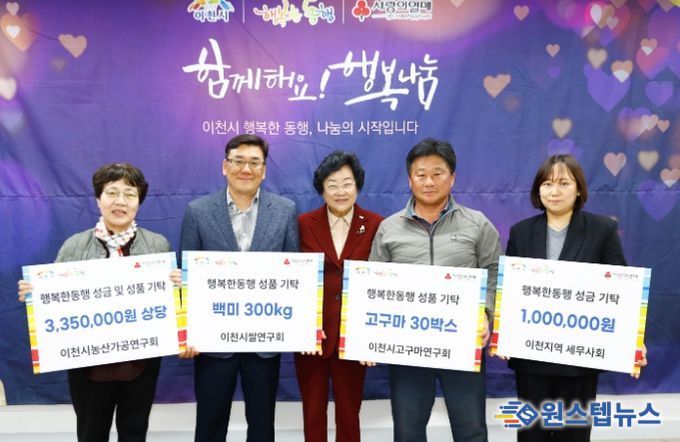 이날 ▲이천시쌀연구회는 백미 10kg 30포 ▲이천시 고구마연구회는 고구마 30박스 ▲ 이천시 농산가공연구회는 성금 130만 원과 식품 135만 원 상당 ▲이천지역 세무사회는 성금 100만 원을 각각 이천시 행복한 동행에 전달했다.