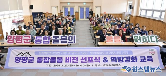 원스텝뉴스 천규영 기자 | 양평군은 ‘의료·요양 등 지역 돌봄의 통합지원에 관한 법률(이하 돌봄통합지원법)’ 시행일인 27일 개군면을 시작으로, 4월 3일까지 관내 12개 읍면을 순회하며 ‘양평군 통합돌봄 비전 선포식’과 인적안전망 역량강화 교육을 실시한다고 밝혔다.