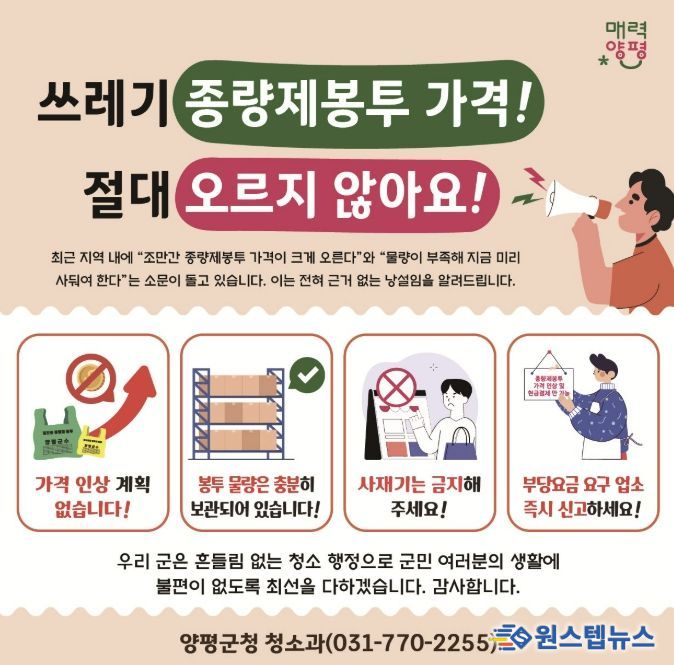원스텝뉴스 이병희 기자 | 양평군은 최근 제기된 종량제봉투 수급 불안 우려와 관련해 “가격 인상 계획은 전혀 없으며, 안정적인 공급 유지에 최선을 다하고 있다”고 밝히며 군민들의 차분한 대응을 당부했다.