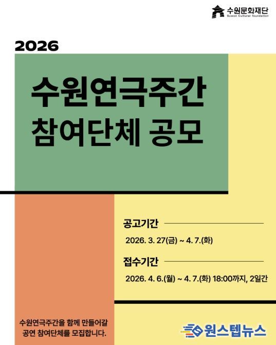 원스텝뉴스 이병희 기자 | 수원문화재단은 지역 공연예술 생태계 활성화와 시민들의 문화 향유 기회 확대를 위해 2026 ‘수원연극주간’에 참여할 문화예술단체를 공개 모집한다.