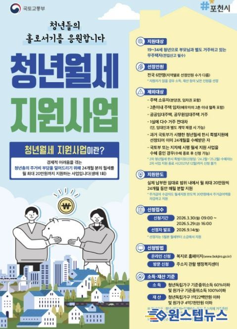 원스텝뉴스 이병희 기자 | 포천시는 오는 3월 30일부터 5월 29일까지 ‘2026년 청년월세 지원사업’ 신청을 받는다.