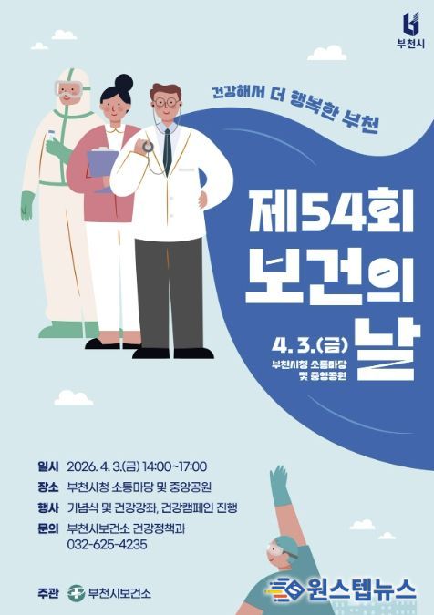 원스텝뉴스 이병희 기자 | 부천시는 4월 3일 ‘제54회 보건의 날’을 맞아 부천시청 소통마당에서는 기념식과 건강강좌를, 중앙공원 일대에서는 건강캠페인을 진행하며 ‘건강해서 더 행복한 부천’을 슬로건으로 기념행사를 연다.