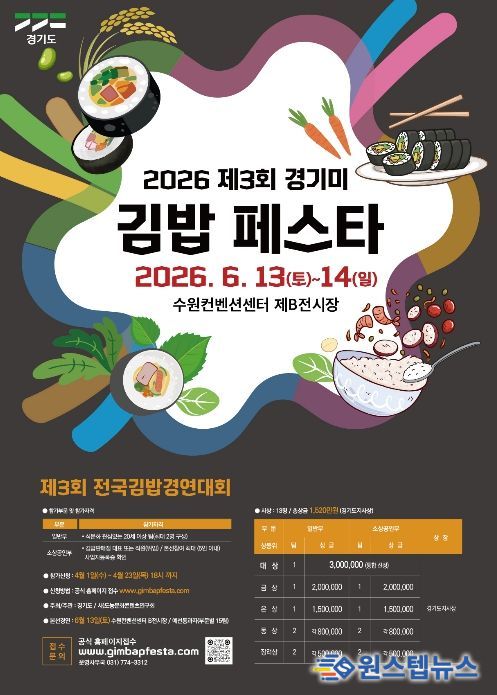 이번 대회는 오는 6월 13일부터 14일까지 수원컨벤션센터에서 개최되는 ‘2026 경기미 김밥 페스타’의 핵심 프로그램이다. 경기도는 4월 1일부터 23일까지 공식 누리집을 통해 참가 신청을 받는다.