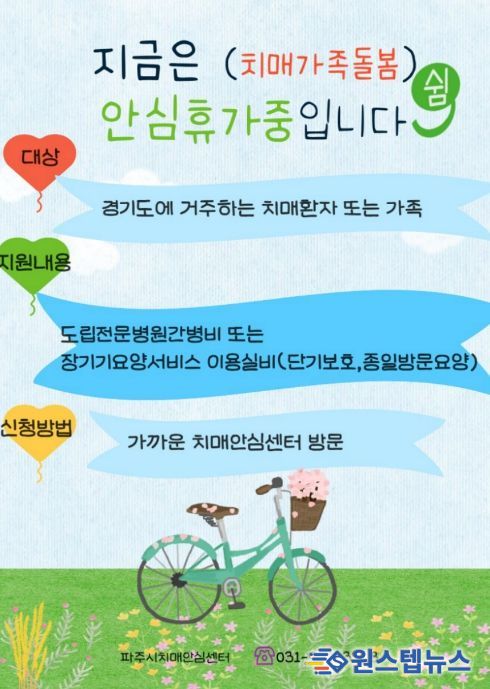 원스텝뉴스 이병희 기자 | 파주시가 장기간 치매환자 돌봄에 지친 부양자들에게 휴가와 단기 돌봄 비용을 지원하는 '치매가족돌봄 안심휴가지원' 사업을 본격 추진한다.