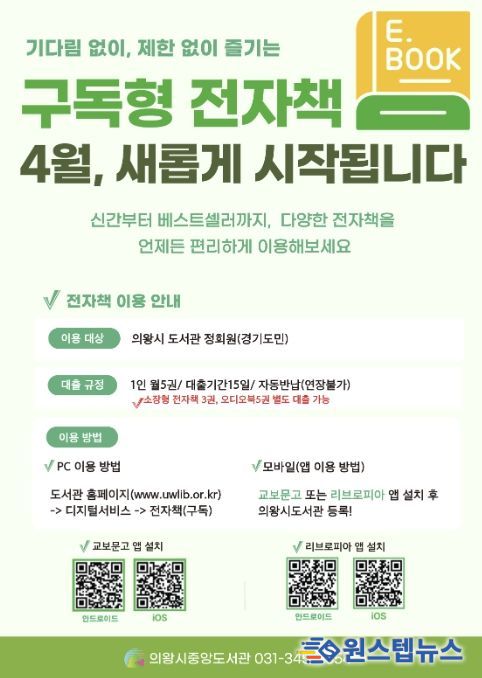 원스텝뉴스 이병희 기자 | 의왕시가 4월부터 시민의 정보 접근성을 높이고 디지털 독서문화 확산을 위해 ‘구독형 전자책 서비스’와 ‘온라인 학술 데이터베이스(DBpia) 서비스’를 도입한다.