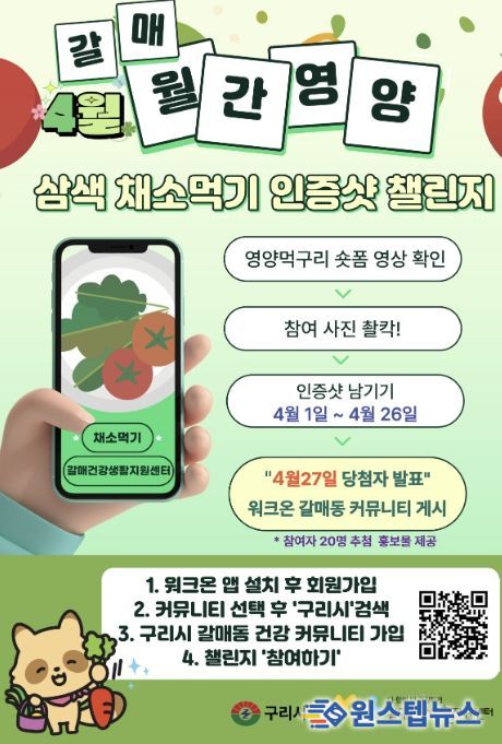 원스텝뉴스 이병희 기자 | 구리시 갈매건강생활지원센터는 오는 4월 1일부터 26일까지 주민 주도형 식습관 개선 사업인 ‘나를 위한 건강미션 - 갈매 월간영양’의 두 번째 프로그램으로 ‘내 식탁 위 무지개를 찾아라! 삼색 채소 먹기 인증사진 챌린지’를 운영한다고 밝혔다.