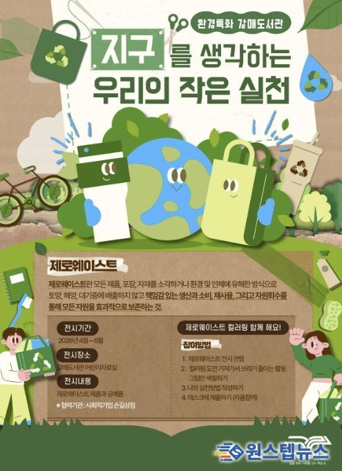 원스텝뉴스 이병희 기자 | 구리시 갈매도서관은 2026년 연중 기획 환경 특화 전시 프로그램 ‘사계절 갤러리’의 일환으로, 2분기 전시 '지구를 생각하는 우리의 작은 실천 – 제로웨이스트'를 4월 1일부터 운영한다고 밝혔다.