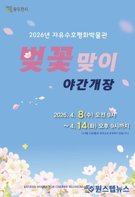 원스텝뉴스 이병희 기자 | 동두천시 자유수호평화박물관은 오는 4월 8일부터 14일까지 6일간(4월 13일 월요일 정기 휴관) 벚꽃 개화기를 맞아 자유수호평화박물관 개관 시간을 기존 오후 6시에서 오후 9시까지 연장 운영한다고 밝혔다.