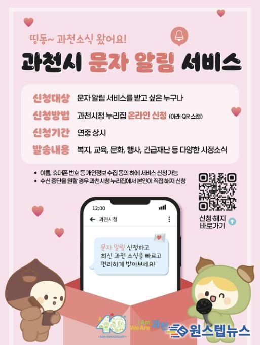 과천시 관계자는 “문자 알림 서비스를 통해 시의 다양한 소식을 시민들에게 적시에 제공되도록 소통을 강화해 나가겠다”라고 밝혔다.