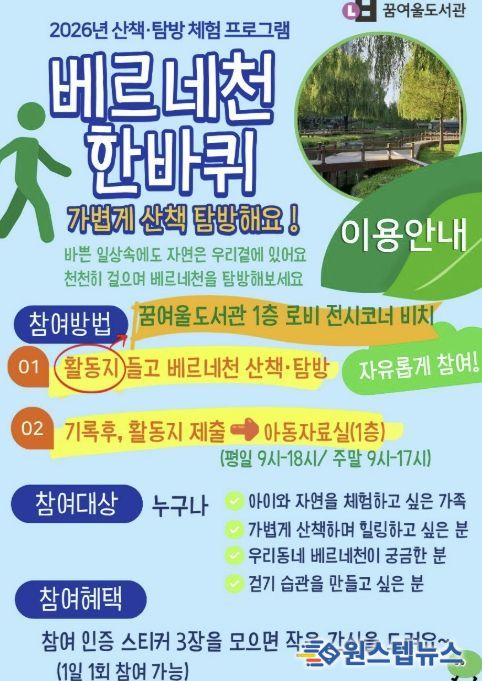 4월에는 수주도서관이 ‘이야기가 있는 마을’을 주제로 골목 드로잉 프로그램을 운영하고, 꿈여울도서관은 베르네천 하천 탐방과 생태 세밀화 그리기를 진행한다. 역곡도서관은 ‘역곡동의 사계’ 사진전과 숲 생태 프로그램을 운영하며, 원미도서관은 청년 대상 정신건강 카드뉴스를 제공하는 ‘부천 청년 멘탈 지키미’ 서비스를 운영한다.