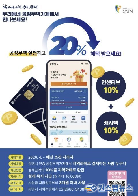 최혜민 광명시장 권한대행(부시장)은 “공정무역과 지역화폐를 연계한 이 사업은 시민 참여 속에서 실질적인 성과를 확인한 정책”이라며 “앞으로도 시민이 일상에서 사회적 가치를 실천할 수 있도록 다양한 정책을 지속 추진하겠다”고 밝혔다.