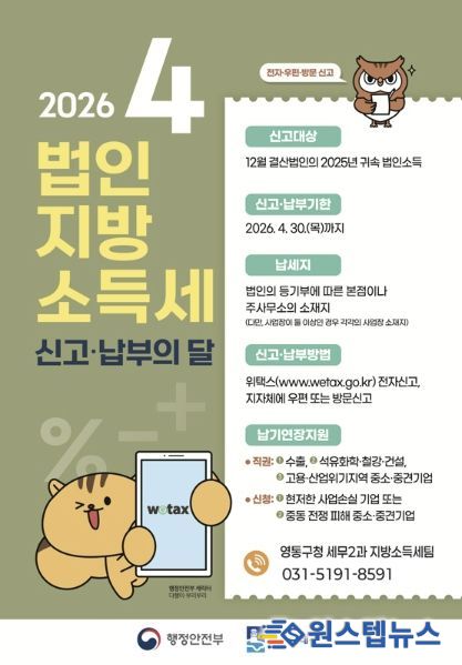 원스텝뉴스 이병희 기자 | 수원시 영통구는 4월 1일부터 30일까지 법인지방소득세 확정신고 기간을 맞아 관내 7,500여 개 법인과 세무대리인을 대상으로 신고 안내를 강화했다. 기한 내 원활한 신고·납부를 돕기 위해 대상 법인과 세무대리인에게 안내문도 발송했다.