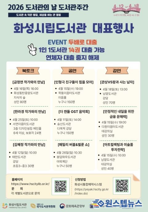 원스텝뉴스 이병희 기자 | 화성특례시는 4월 12일 ‘도서관의 날’을 맞아 12일부터 18일까지 ‘2026년 도서관주간’을 운영하고, 시민을 위한 다채로운 독서문화 행사를 마련했다.