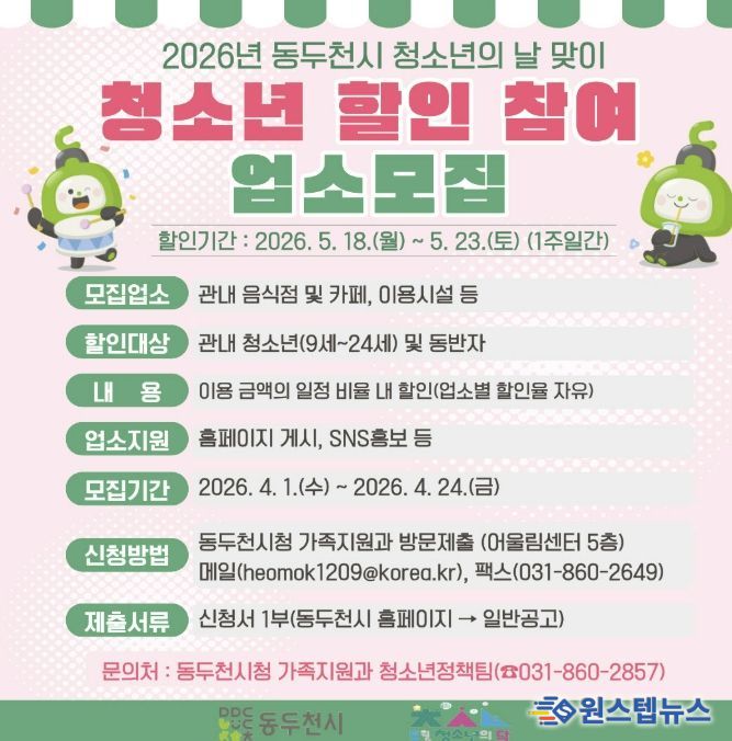 이번 ‘청소년 할인 주간’은 동두천시에 거주하는 청소년(9세~24세)과 동반 보호자를 대상으로 진행하며, 참여 업소에서 자율적으로 정한 할인 혜택(10~30% 할인 또는 증정 서비스 등)을 받을 수 있다.