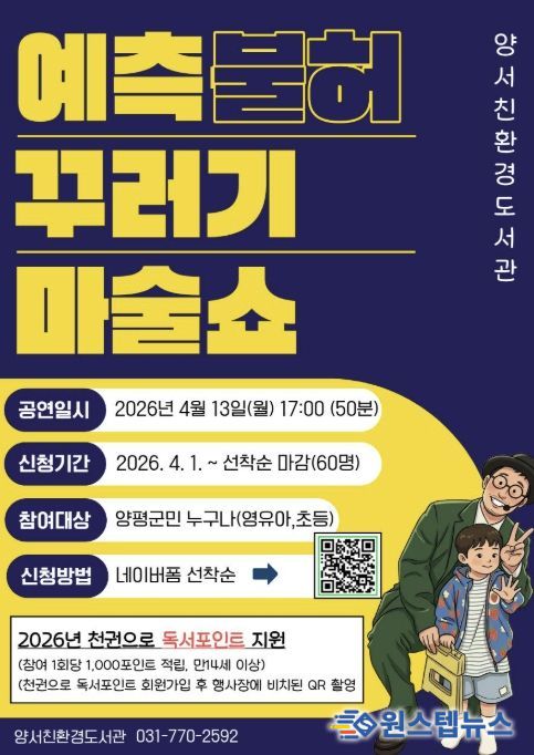 원스텝뉴스 천규영 기자 | 양서친환경도서관은 도서관 주간(4.12.~18.)을 맞아 지역 주민들이 도서관을 더욱 친숙하게 느끼고 독서의 즐거움을 누릴 수 있도록 마술 공연과 도서 나눔 등 다양한 행사를 운영한다고 밝혔다.