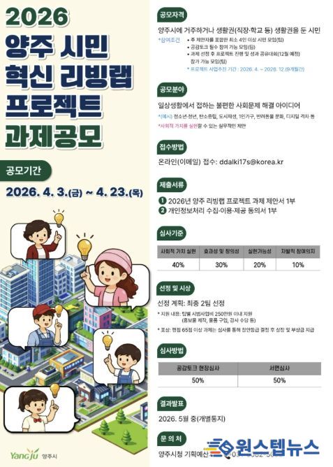 원스텝뉴스 이병희 기자 | 양주시가 시민이 일상에서 겪는 사회문제를 직접 발굴하고 해결 방안을 모색하는 ‘2026년 양주 시민 혁신 리빙랩 프로젝트’ 공모를 오는 23일까지 진행한다.
