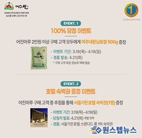 원스텝뉴스 이병희 기자 | 여주시 농산업 공동브랜드 활성화센터는 오는 4월 19일까지 어진마루몰에서 여주쌀 2만 원 이상 구매 고객 전원에게 500g 쌀을 추가 증정하는 이벤트를 진행한다고 밝혔다.
