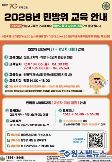 원스텝뉴스 이병희 기자 | 김포시는 2026년 상반기 민방위 대원의 안보 의식 고취와 재난 대응 역량 강화를 위해 ‘2026년 상반기 민방위 교육’을 본격적으로 시행한다고 밝혔다. 이번 교육은 민방위 대원의 연차에 따라 집합교육과 사이버교육으로 구분되어 진행되며, 특히 올해는 연차별 일정을 세분화해 운영한다.