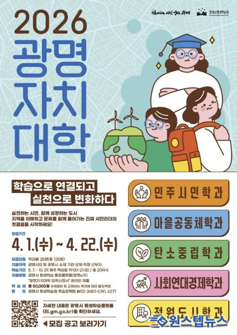 원스텝뉴스 이병희 기자 | 광명시가 시의 핵심의제인 평생학습 마을리더 양성과정 ‘광명자치대학’ 2026년 신입생 125명을 오는 22일까지 모집한다.