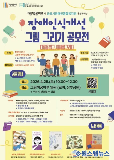 원스텝뉴스 이병희 기자 | 군포 그림책꿈마루와 군포시장애인종합복지관이 공동 주관하는 장애인식 개선 그림그리기 공모전이 오는 4월 25일(토) 10시부터 그림책꿈마루 로비 및 상부공원에서 진행될 예정이다.