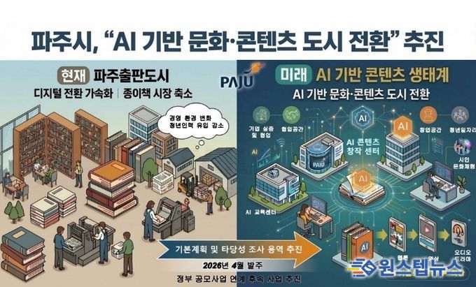 원스텝뉴스 이병희 기자 | 파주시는 출판도시의 지속 가능한 성장 기반 마련을 위해 “인공지능(AI) 기반 문화·콘텐츠 도시 전환을 위한 기본계획 및 타당성 조사 용역”을 추진한다. 관련 용역비는 2026년 제1회 추가경정예산에 신규 편성·확정됐다.