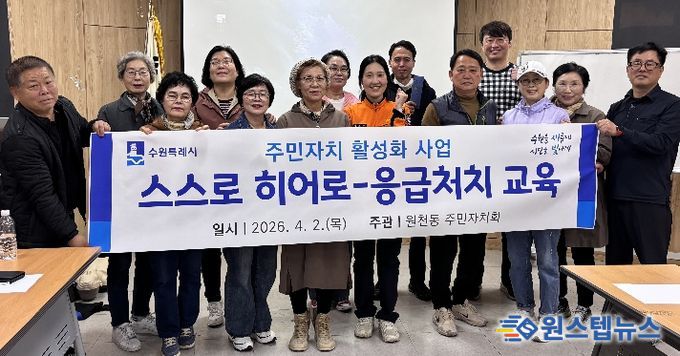 원스텝뉴스 이병희 기자 | 수원시 영통구 원천동은 지난 2일 원천동 주민자치회가 행정복지센터 소회의실에서 2026년 주민자치회 활성화 사업의 일환으로 응급처치 교육 ‘스스로 히어로’를 실시했다고 밝혔다.