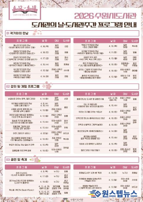 수원시 관계자는 “제62회 도서관주간을 맞아 작가와의 만남, 독서문화강의, 공연, 체험프로그램 등 다양한 행사를 준비했다”며 “시민들이 도서관에서 함께 소통하고 즐거운 시간을 보내길 바란다”고 말했다.