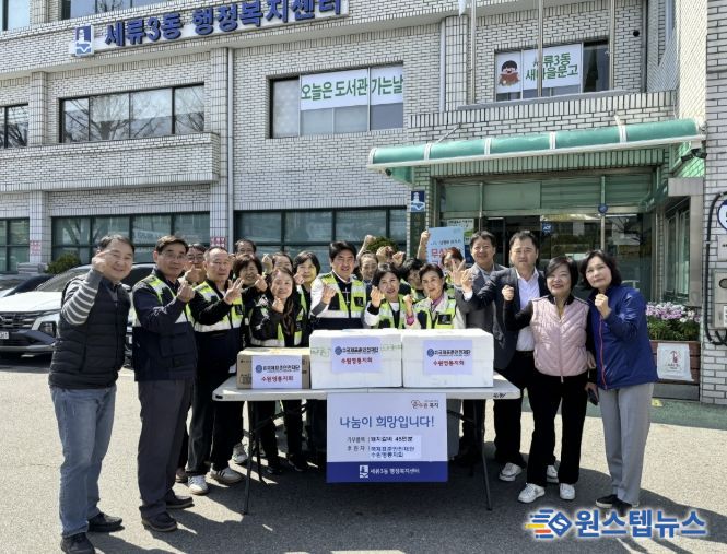 재단은 물품 전달 후 세류3동 관계자들과 함께 인근 수원천 일대에서 쓰레기를 수거하며 쾌적한 마을 환경 조성에 힘을 보탰다.