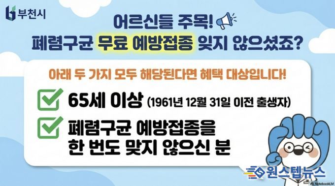 원스텝뉴스 이병희 기자 | 부천시는 폐렴으로 인한 중증 질환과 합병증을 예방하기 위해 65세 이상 어르신을 대상으로 폐렴구균 예방접종 참여를 당부하고 있다.