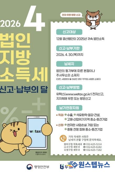 원스텝뉴스 이병희 기자 | 부천시는 법인지방소득세 신고가 집중되는 4월을 맞아 이달 30일까지 ‘법인지방소득세 집중 신고기간’을 운영한다. 이에 따라 시는 신고 기간에 구청 세무부서에 전용 상담창구를 설치해 신고 편의를 지원할 예정이다.