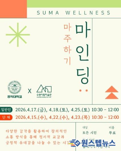 원스텝뉴스 천규영 기자 | 경기도 수원시립미술관은 고령화, 우울, 사회적 단절 등의 문제를 예술로 접근하고, 치유하는 사회적 처방 프로그램 2026 'SUMA 웰니스(Wellness) 마인딩: 마주하기'를 4월 15일부터 운영한다.