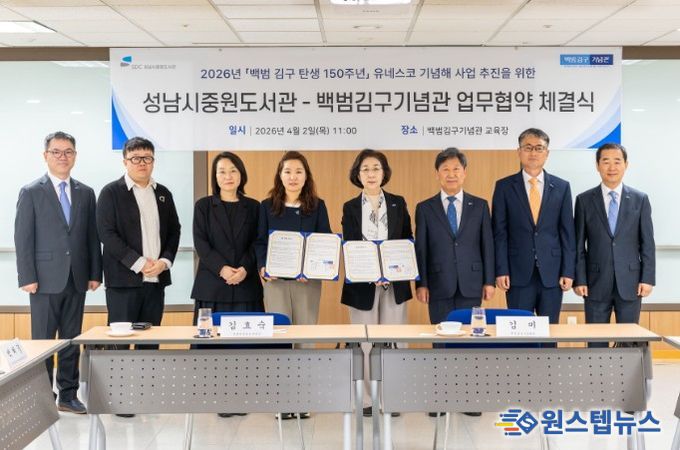 원스텝뉴스 천규영 기자 | 성남도시개발공사 중원도서관은 2026년 유네스코 기념해로 지정된 ‘김구 탄생 150주년’을 맞아 백범김구기념관과 업무협약을 체결했다고 6일 밝혔다.