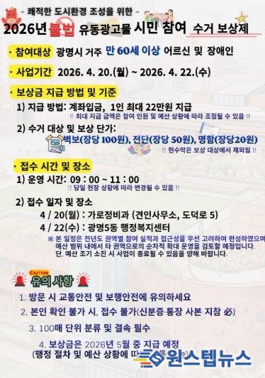 엄인봉 가로정비과장은 “불법광고물 수거보상제는 시민 자발적 참여로 행정력이 미치기 어려운 사각지대까지 세심하게 살필 수 있는 뜻깊은 사업”이라며 “시민 작은 실천이 모여 안전하고 쾌적한 도시 환경을 조성하는 밑거름이 되는 만큼 많은 관심과 동참을 바란다”고 밝혔다.