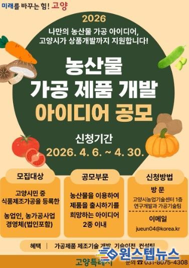 원스텝뉴스 이병희 기자 | 고양특례시는 농업인의 참신한 아이디어를 반영한 가공 제품을 발굴하고자 ‘2026년 농산물 가공 제품개발 아이디어 공모’를 실시한다.
