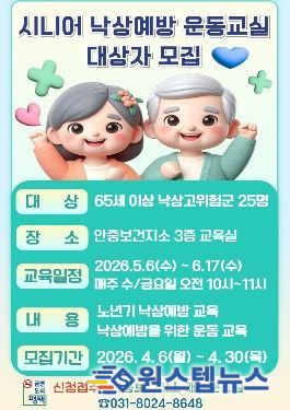 운동 전문 강사를 초빙하여 운영하는 ‘시니어 낙상예방 운동교실’은 △낙상 예방 교육(낙상 위험성 및 발생원인 교육, 낙상 발생 예방을 위한 환경 개선 및 개인 주의사항 등) △낙상 예방 운동(스트레칭, 코어 강화 운동, 균형 증진 운동, 소도구 운동 등)으로 구성된다.
