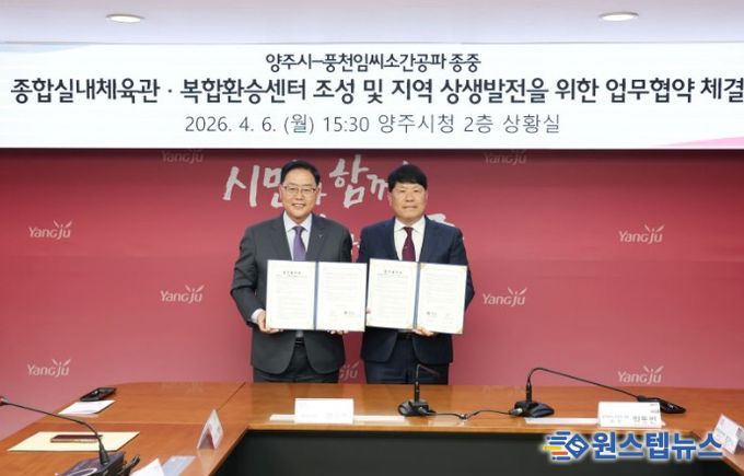 원스텝뉴스 이병희 기자 | 양주시가 6일 시청 시장실에서 풍천임씨소간공파 종중과 ‘종합실내체육관·복합환승센터 조성 및 지역 상생발전을 위한 업무협약(MOU)’을 체결했다.