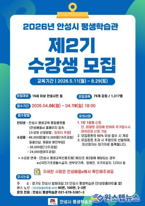 원스텝뉴스 이병희 기자 | 안성시는 시민의 배움 기회를 확대하고 평생학습 참여를 활성화하기 위해 '2026년 평생학습관 제2기 프로그램' 수강생을 모집한다.