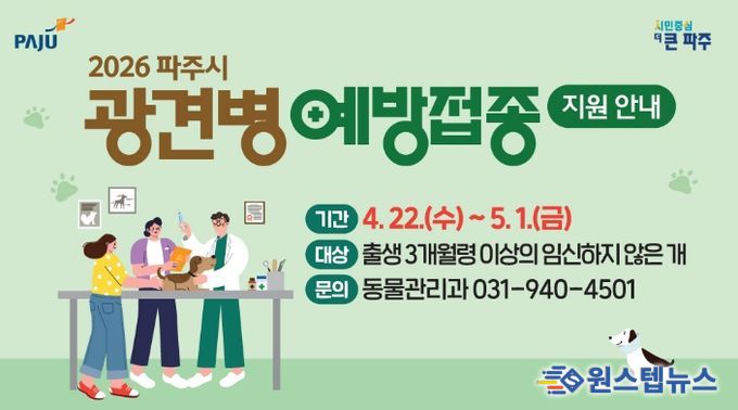시는 광견병 예방 백신 7,000마리분을 무상 지원하며, 예방접종을 희망하는 반려견 보호자는 36개 지정 동물병원을 방문해 시술비 1만 원만 부담하면 접종이 가능하다. 참여 동물병원 목록은 파주시청 누리집에 게시된 공고문을 통해 확인할 수 있다.