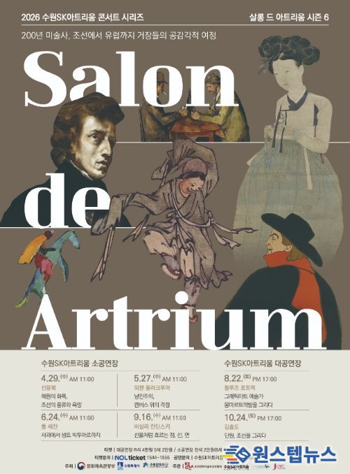 4월 29일에는 수원SK아트리움의 대표공연인 ‘살롱 드 아트리움’이 여섯 번째 시즌으로 돌아온다. ‘살롱 드 아트리움’은 명화와 클래식 연주를 함께 보고 듣는 콘서트 시리즈다. 올해는 ‘200년 미술사, 조선에서 유럽까지의 거장들의 공감각적 여정’이라는 주제 아래 4월부터 10월까지 관객들을 맞이할 예정이다.