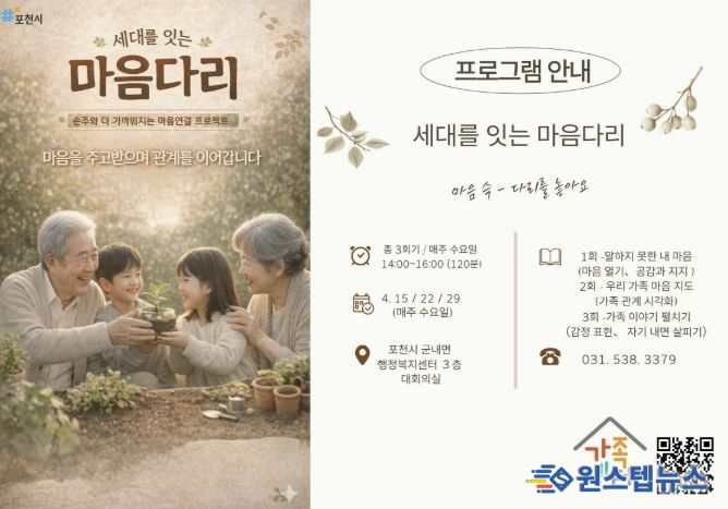 최선희 더 큰 행복 포천시가족센터장(겸임 가족여성과장)은 “이번 프로그램은 지역사회 전문가와 협력해 어르신들에게 실질적인 소통 방법을 전달하는 뜻깊은 기회가 될 것”이라며 “앞으로도 찾아가는 맞춤형 서비스를 통해 세대 간 공감이 살아 있는 따뜻한 지역사회를 만드는 데 힘쓰겠다”고 말했다.