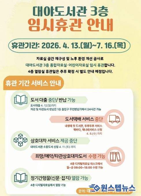원스텝뉴스 이병희 기자 | 군포시 대야도서관은 노후된 자료실 환경을 개선하고 이용자 중심의 효율적인 공간 재구성을 위해 오는 4월 13일부터 7월 16일까지 리모델링 공사를 실시하고, 해당 기간동안 3층 자료실을 임시휴관한다고 밝혔다.