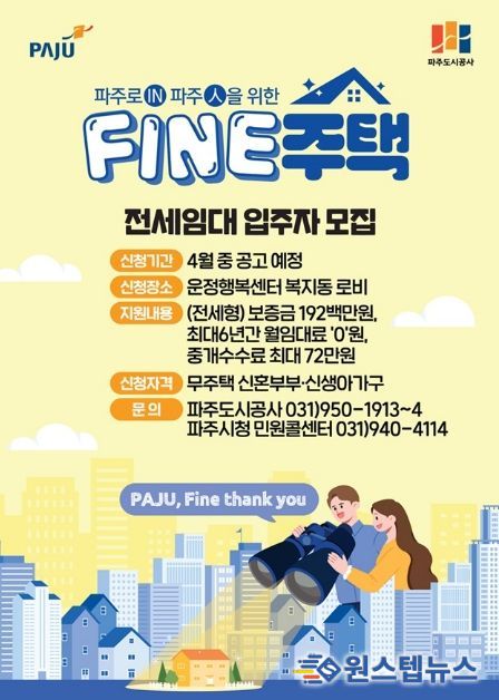 원스텝뉴스 이병희 기자 | 파주시가 신혼부부와 신생아 가구의 주거비 부담 완화를 위해 파주형 기본주택 ‘파인(FINE)주택’전세임대사업을 본격 추진한다.