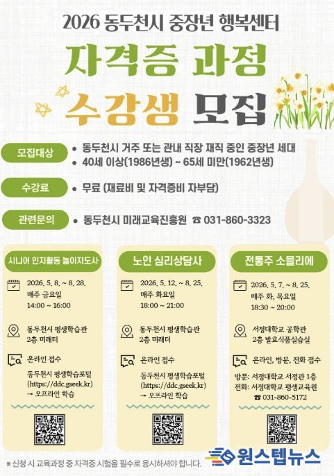 원스텝뉴스 이병희 기자 | 동두천시 미래교육진흥원은 지역 내 중장년층의 성공적인 인생 2막과 안정적인 사회 참여를 지원하기 위해 ‘2026년 중장년 행복센터 자격증 과정’ 수강생을 모집한다고 밝혔다.