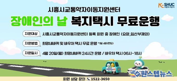 원스텝뉴스 이병희 기자 | 시흥도시공사는 오는 4월 20일 ‘제46회 장애인의 날’을 맞아 교통약자의 이동 편의 증진과 사회참여 확대를 위해 무료 운행 서비스를 제공한다고 밝혔다.